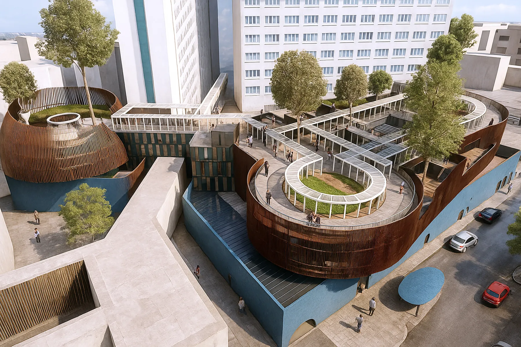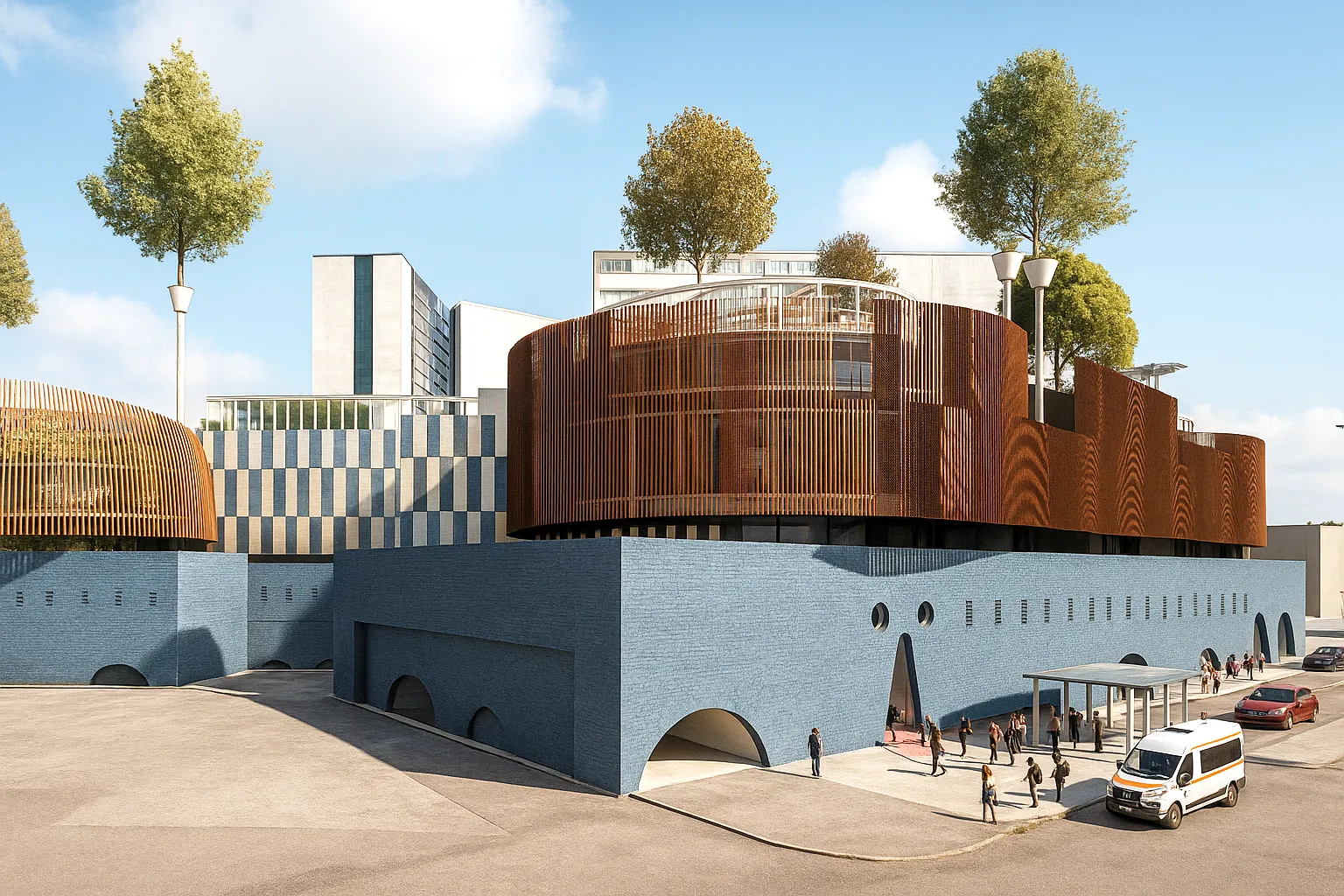 The set of Obstetric-Gynecological and Pediatric services involves very particular pathologies and categories of patients. More specifically, it seems to us that a hospital that is the place for newborns should take on, in its architecture, the character of a place of memory, a place where the first wonderful act of entry into life takes place and where a family is enriched with a new component. A salient event in the life of those involved which we believe should explain, even in architecture, the importance of the event and the celebratory and lasting characteristics that befit it.